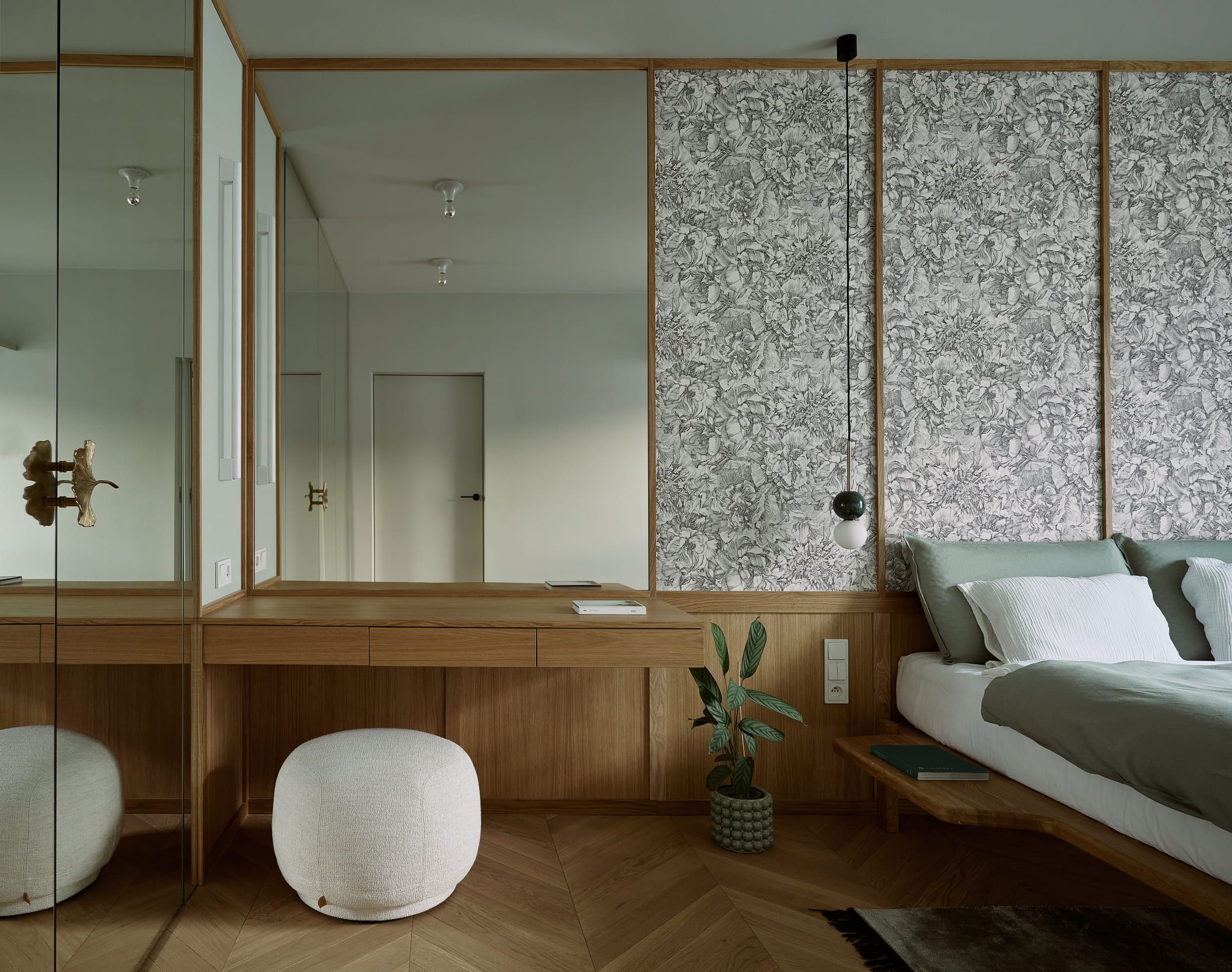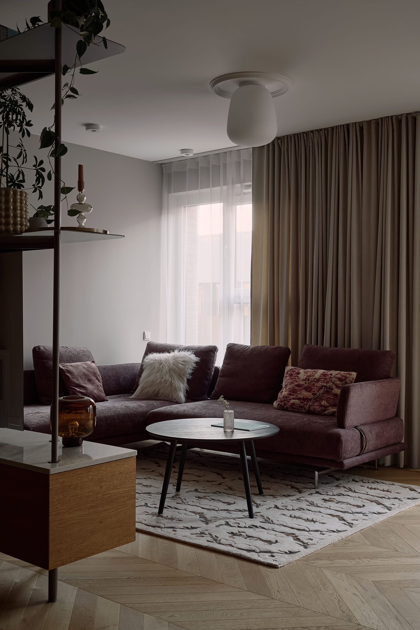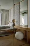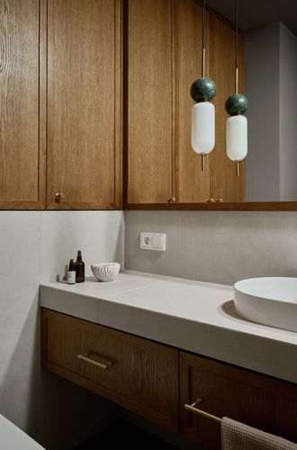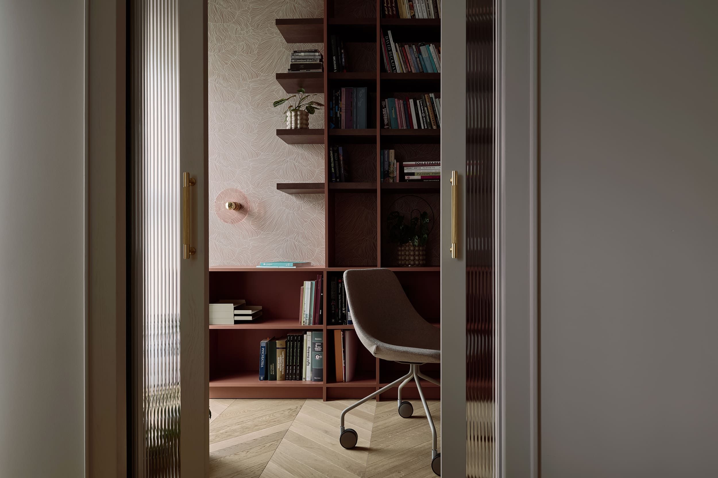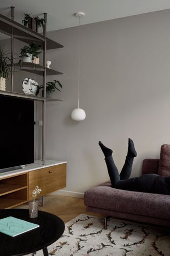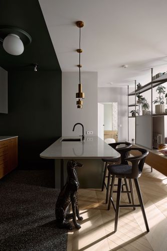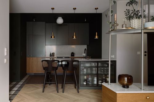 Mieszkanie otrzymało zupełnie nowy układ, wydzieliliśmy mały, uroczy gabinet do pracy zdalnej. Pozostałą powierzchnie otworzyliśmy na kuchnię tworząc całkiem przestronny salon. W mieszkaniu znajdziemy dużo ciekawych detali i połączeń materiałowych, które zachwycają nasze oczy za każdym razem kiedy patrzymy na zdjęcia z realizacji. Mimo trudów podczas remontu, powstało wyjątkowe i przytulne wnętrze.